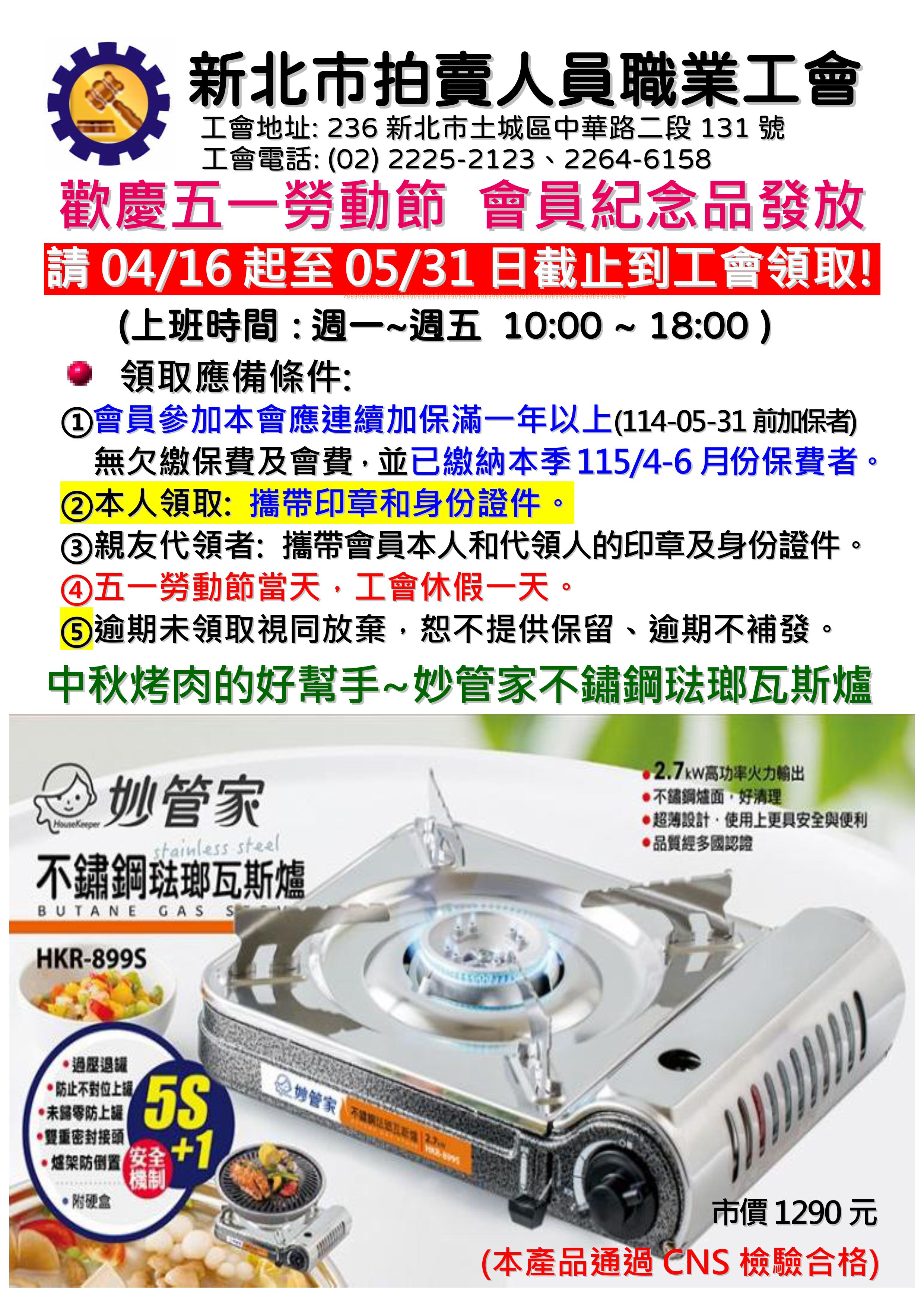 2026-03-20 歡慶五一勞動節會員紀念品04/16起至05/31日截止到工會領取 新北市拍賣人員職業工會歡慶五一勞動節 會員紀念品發放 請04/16起至05/31日截止到工會領取! (上班時間 : 週一~週五 10:00 ~ 18:00 ) 回上一頁